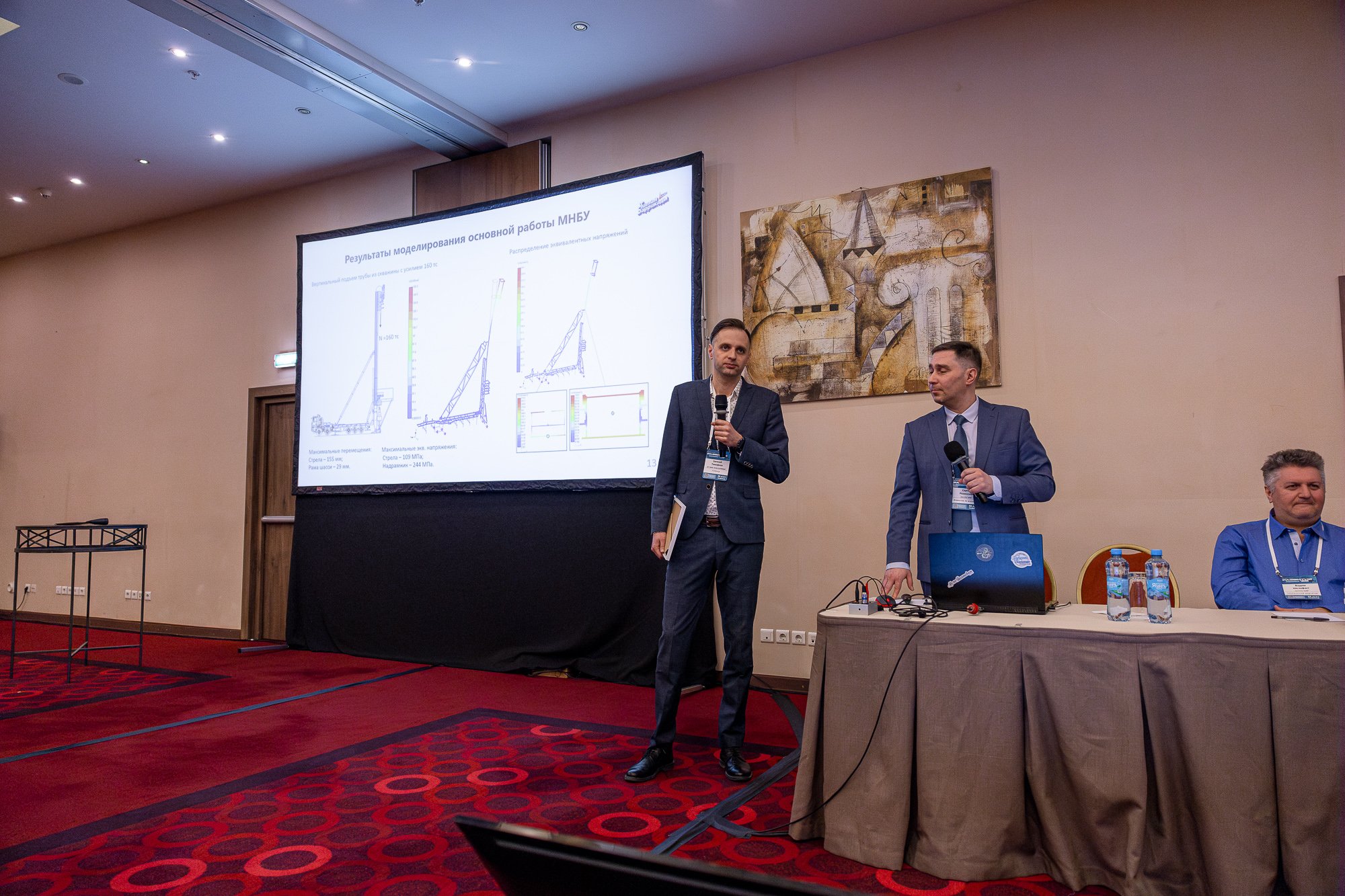 В заключительном докладе пленарной части ведущий инженер-конструктор Евгений Константинович Тимофеев поделился со слушателями опытом использования на предприятии ФНПЦ «Титан-Баррикады» программного обеспечения APM WinMachine при проектировании мобильной наклонной буровой установки (МНБУ). Актуальность работы над данной тематикой продиктована необходимостью добычи углеводородов в труднодоступных местах, в частности, из угольных пластов на Кузбассе, что дополнительно обеспечит безопасность труда шахтеров. Сложность поставленной перед предприятием задачи складывалась из многих факторов: мобильности установки, ограничений по габаритам подходящих колесных тягачей, большое количество расчетных вариантов работы устройства. Благодаря опыту конструкторов и расчетчиков предприятия удалось разработать уникальную конструкцию МНБУ, удовлетворяющую всем условиям поставленного технического задания. При этом расчетные КЭ-модели всех основных элементов данного бурового комплекса строились и рассчитывались с использованием APM WinMachine: модель шасси тягача, надрамник, подстрелок, средняя секция стрелы и т.д. Часть расчетных моделей имела так называемое стержневое представление, часть стержнево-пластинчатое, а наиболее сложные узлы, например, каретка силового привода, требовали комплексных моделей, содержащих в своем составе и стержни, и пластины, и твердотельные КЭ. Каждая модель проходила целый комплекс виртуальных испытаний, начиная от моделирования напряженно-деформированного состояния в походном положении МНБУ, далее имитации сборки стрелы на месте бурения и, заканчивая анализом всех рабочих режимов при вертикальном и наклонном бурении, а также извлечении трубы из скважины. Отдельно отметим, что специалисты ФНПЦ «Титан-Баррикады» имеют большой стаж работы с программным обеспечением APM WinMachine, и тем не менее постоянно повышают свою квалификацию и поддерживают версию ПО в актуальном состоянии – за что хочется выразить им отдельную благодарность! Такая плотная работа позволяет нам, как разработчикам, иметь актуальную обратную связь и оперативно реагировать на поступающие запросы о совершенствовании текущей версии ПО. |
